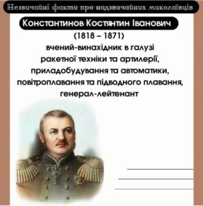 Рубрика «Незвичайні факти про надзвичайних миколаївців» продовжує знайомити вас із цікавими епізодами та незвичайними фактами із життя відомих миколаївців. Більше дізнатися про Костянтина Івановича Константинова можете на сайті Миколаївської обласної бібліотеки для дітей Константинов Костянтин Іванович