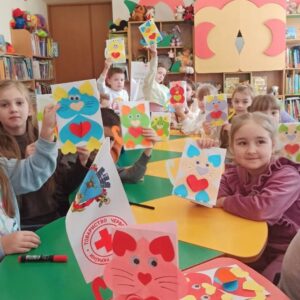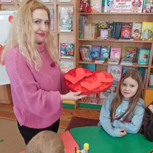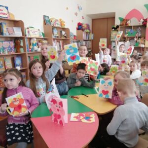 Сьогодні, 14 лютого, до бібліотеки завітали наші улюблені читайлики-першокласники Миколаївської гімназії 35. Разом ми дізналися про таке чудове свято, пограли в ігри, зробили власноруч велике серце побажань, пригадали мультяшно-книжкові закохані парочки. А на майстерці виготовляли листівку- валентинку “Котик”
