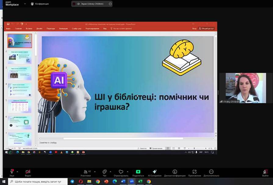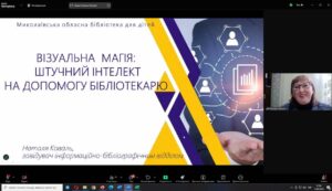 Сьогодні, 17 квітня, у Миколаївській обласній бібліотеці для дітей відбулося практичне онлайн-заняття «Впровадження штучного інтелекту в бібліотечній справі». До заходу долучилося понад 60 бібліотечних фахівців об’єднаних територіальних громад міських, селищних, сільських рад, що працюють з дітьми з різних куточків Миколаївської області.