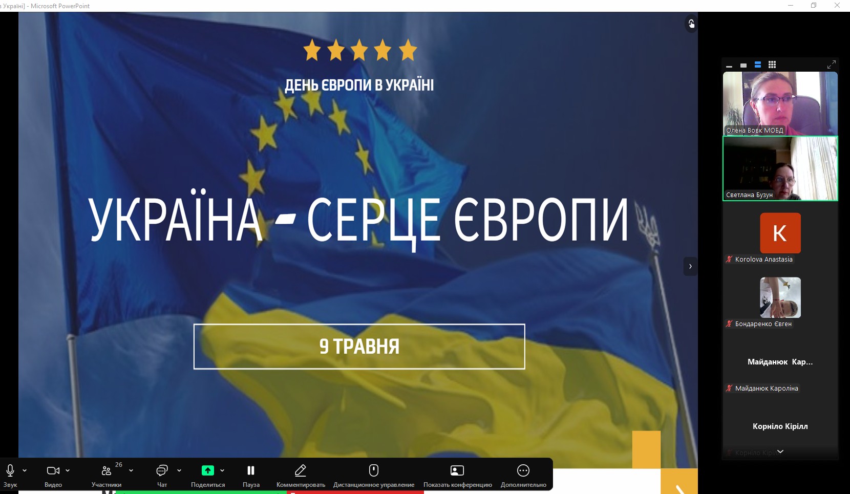 У День Європи говоримо про європейські цінності, про демократію та свободу. Адже Україна наразі є не лише географічним центром, а й щитом Європи, яка захищає не тільки свою землю від зла, а й увесь європейський світ. Учні сьомих класів Миколаївська загальноосвітня санаторна школа №4 взяли участь у годині спілкування “Україна – серце Європи”.