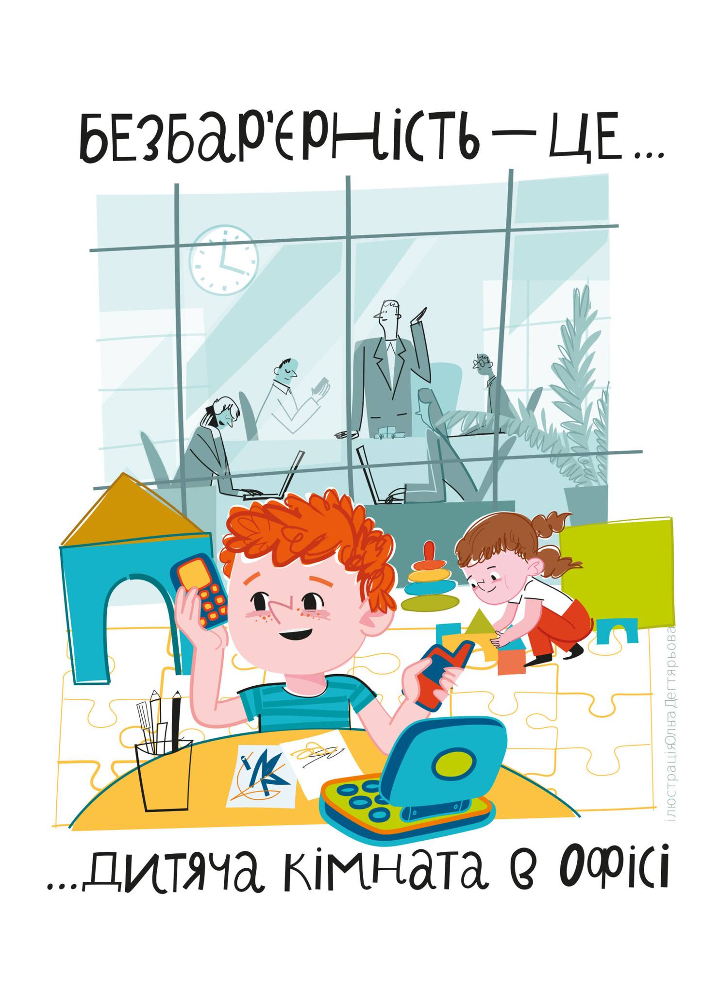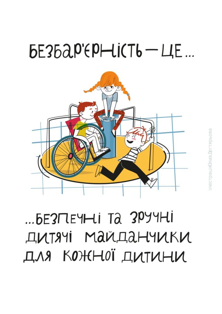 Але якщо на майданчику є пандус – такий пологий спуск замість сходинок – то бар’єру немає! Кожен може легко піднятися і гратися разом. Ось це і є безбар’єрність!