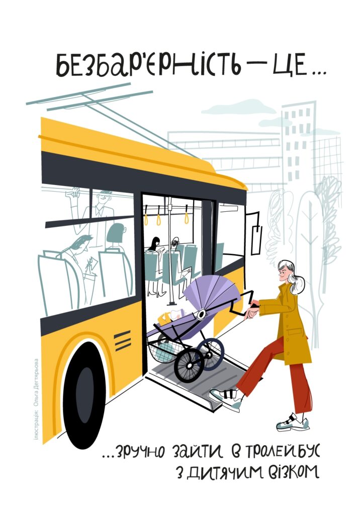 • Доступність: Це коли кожен може легко потрапити куди завгодно – до магазину, бібліотеки, школи – незалежно від того, чи вміє він швидко бігати, чи добре бачить, чи добре чує. Наприклад, якщо в автобусі є низька підлога, щоб було зручно заїхати з візочком – це доступність.