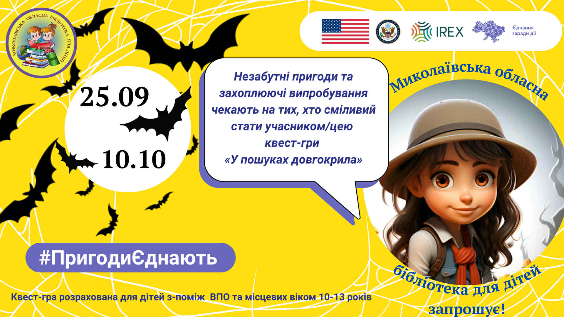 Миколаївська обласна бібліотека для дітей у партнерстві з программою «Єднання заради дії», яка реалізується IREX за підтримки Державного департаменту США, запрошує молодь ВПО та місцевих мешканців віком 10–13 років взяти участь в інтерактивній квест-грі «У пошуках Довгокрила».