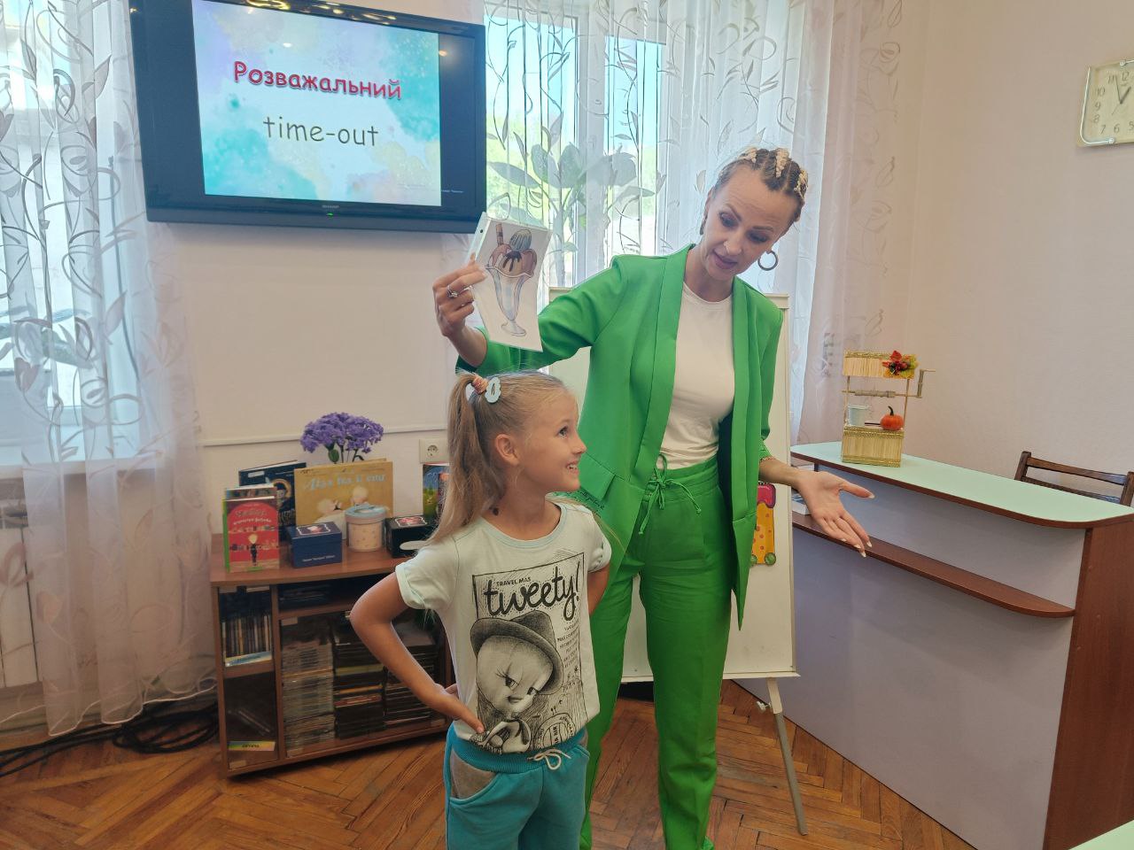 Для вихованців миколаївської гімназії №7 це було перше знайомство з чарівною мисткинею. Кожна її картина викликала безліч позитивних емоцій та посмішок. А як цікаво було складати власну розповідь за картиною художниці, знаходити відмінності між двома однаковими картинами і малювати свої картини у стилі Євгенії Гапчинської.