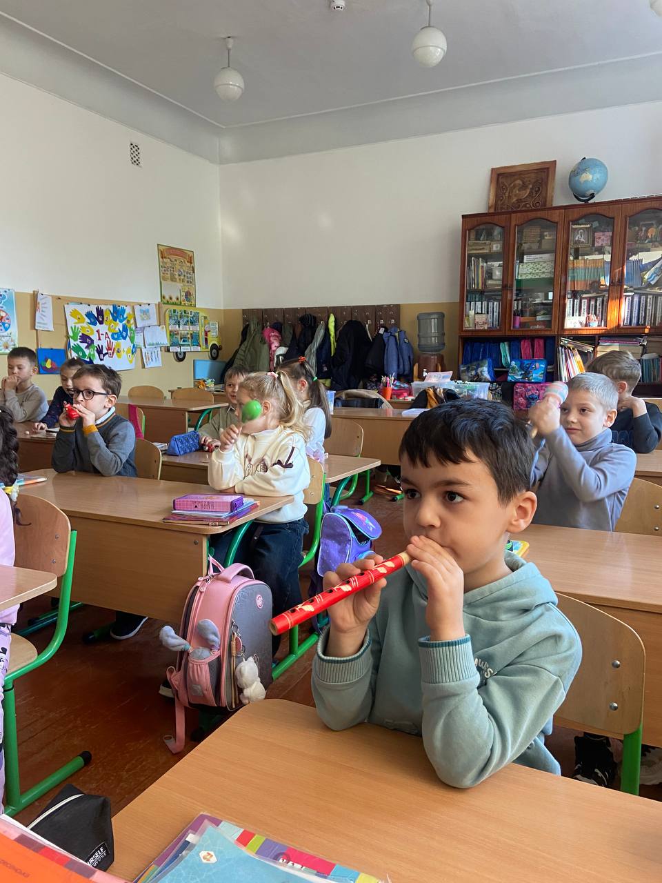 Наше знайомство з «першачками» миколаївської гімназії №13 почалося з розповіді про музику і музичні інструменти. Говорили про різновид музичних інструментів, особливості їх звучання , історію походження. До того ж малеча мала змогу потримати в руках і навіть зіграти не деяких з інструментів. Ігри «Вгадай по звуку музичний інструмент» та «Відтвори звук музичного інструменту » допомогли дітям запам’ятати якомога більше музичних інструментів.