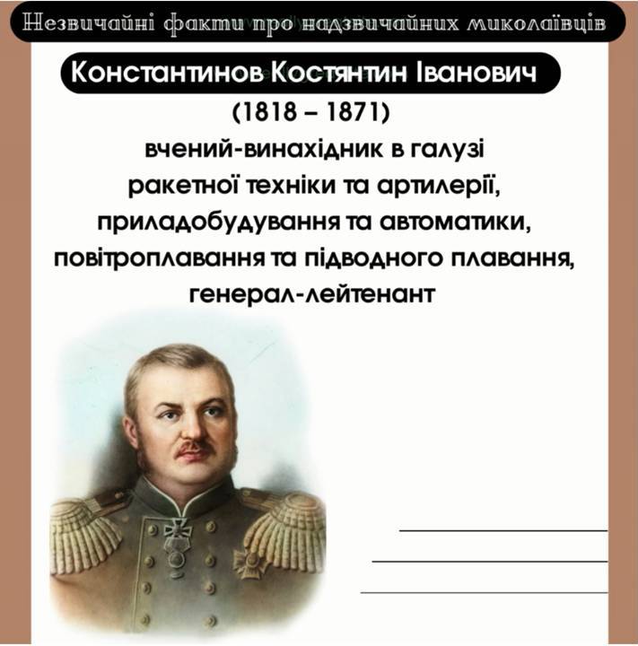Рубрика «Незвичайні факти про надзвичайних миколаївців» продовжує знайомити вас із цікавими епізодами та незвичайними фактами із життя відомих миколаївців. Більше дізнатися про Костянтина Івановича Константинова можете на сайті Миколаївської обласної бібліотеки для дітей