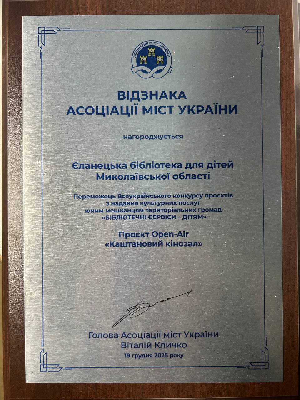 Креативний та змістовний Проєкт бібліотеки Open-Air «Каштановий кінозал» здобув високу оцінку на загальнодержавному рівні! Проєкт увійшов до десятки найкращих на Всеукраїнському турі Конкурсу «Бібліотечні сервіси – дітям» і отримав відзнаку від Асоціації міст України!