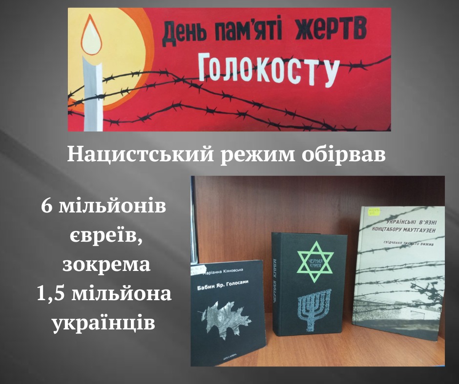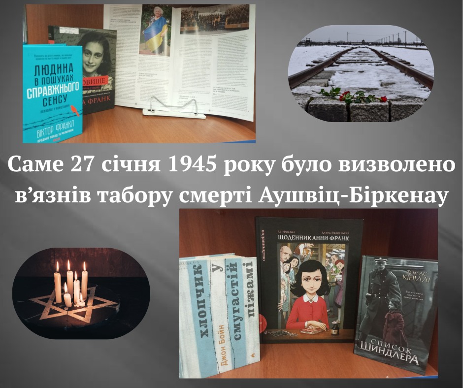 У бібліотеці діє книжкова виставка, присвячена одній із найтрагічніших сторінок історії людства — Голокосту. Ми вшановуємо пам’ять 6 мільйонів євреїв, зокрема 1,5 мільйона українців, чиї життя обірвав нацистський режим. Серед представлених матеріалів — книги про долі людей, які пройшли крізь нацистські табори смерті. Зокрема, на виставці згадується історія життя пані Анастасії Гулей – колишньої бранки німецьких концтаборів “Аушвіц-Біркенау”, “Бухенвальд” і “Берґен-Бельзен”. Її ще 17-річною дівчиною вивезли з України працювати остарбайтеркою в окуповану Польщу. А за втечу з примусових робіт її відправили у нацистські “табори смерті”. Дізнатися більше про її історію можна за посиланням: