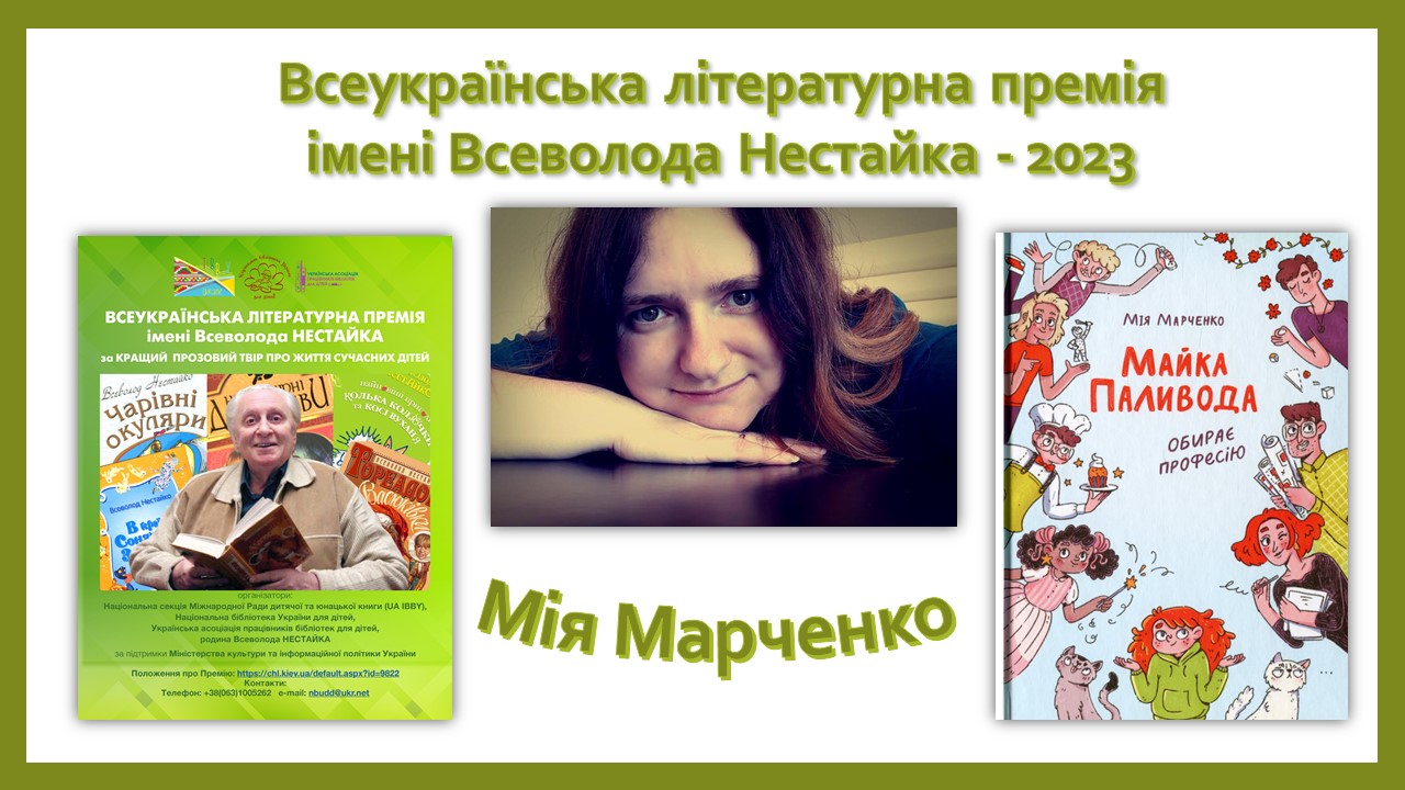 2023 рік − Мія Марченко за добру світлу надзвичайно захопливу книжку «Майка Паливода обирає професію» (видавництво «Читаріум»)