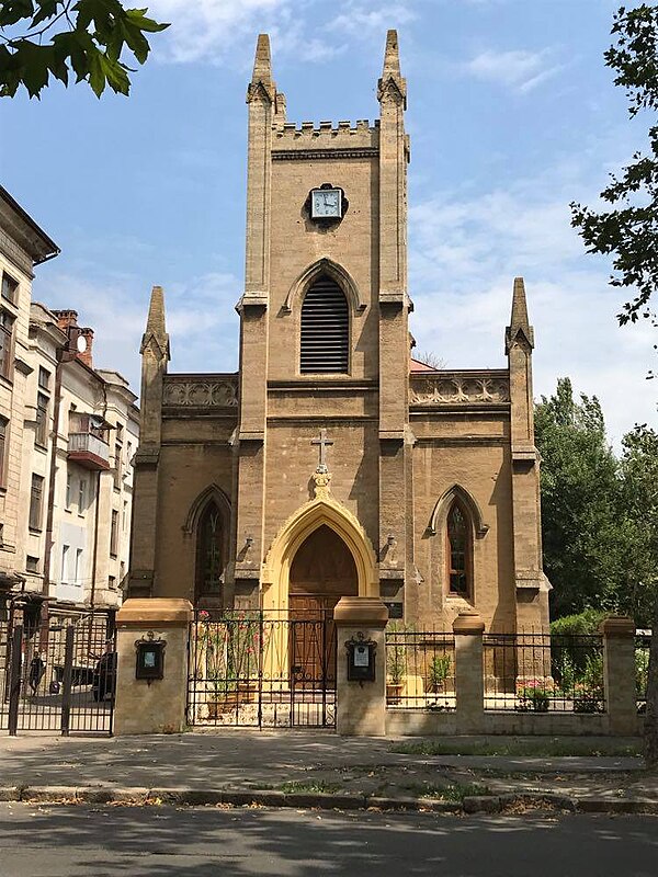 За проєктом архітектора, фасад церкви передбачався у бік Німецької вулиці (нині Олексія Вадатурського). Але потім були внесені корективи в проєкт Чарльза Акройда, і фасад церкви перенесли з Німецької на Адміральську вулицю.
