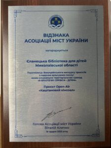 Наші щирі вітання колективу Єланецька бібліотека для дітей КЗ “ПБ Єланецької селищної ради “ – керівниця Анастасія Чорна! Пишаємося успіхами Миколаївщини! Креативний та змістовний Проєкт бібліотеки Open-Air «Каштановий кінозал» здобув високу оцінку на загальнодержавному рівні! Проєкт увійшов до десятки найкращих на Всеукраїнському турі Конкурсу «Бібліотечні сервіси – дітям» і отримав відзнаку від Асоціації міст України! …