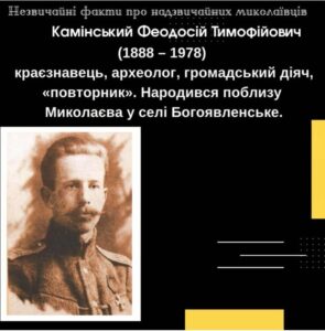 Рубрика «Незвичайні факти про надзвичайних миколаївців» продовжує знайомити вас із цікавими епізодами та незвичайними фактами із життя відомих миколаївців. Більше дізнатися про Камінського Феодосія Тимофійовичаможете на сайті Миколаївської обласної бібліотеки для дітей Камінський Феодосій Тимофійович